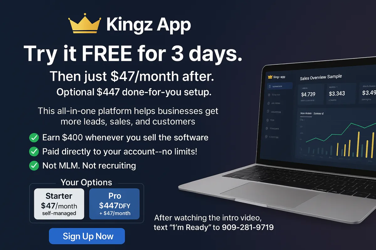 Yes. Approved affiliates can resell the Kingz App and earn commissions. We’ll give you a unique funnel and tools to launch your own income stream fast. Ask about our Partner Program to get started.